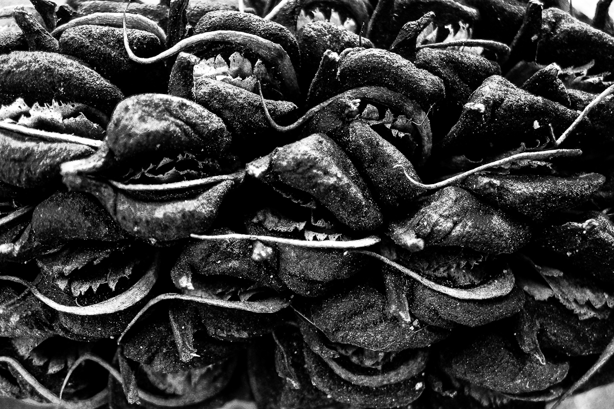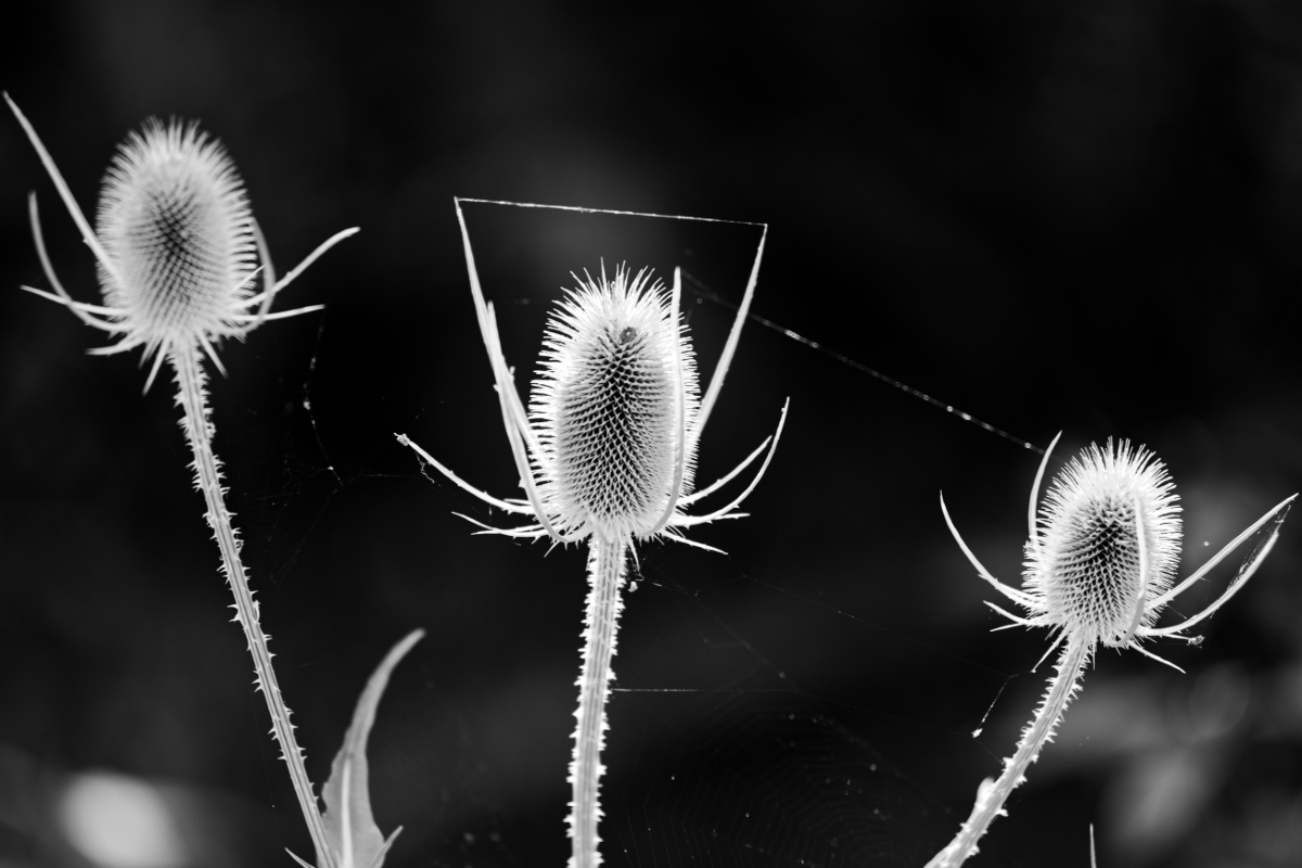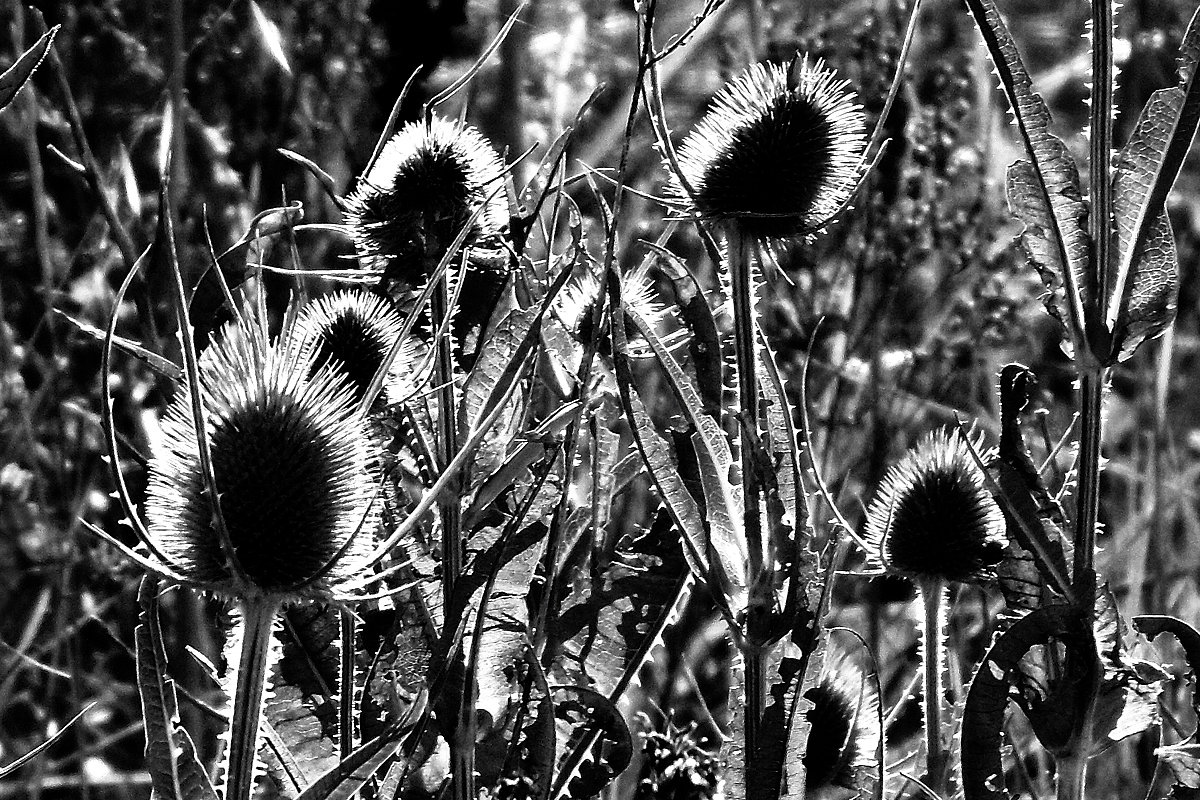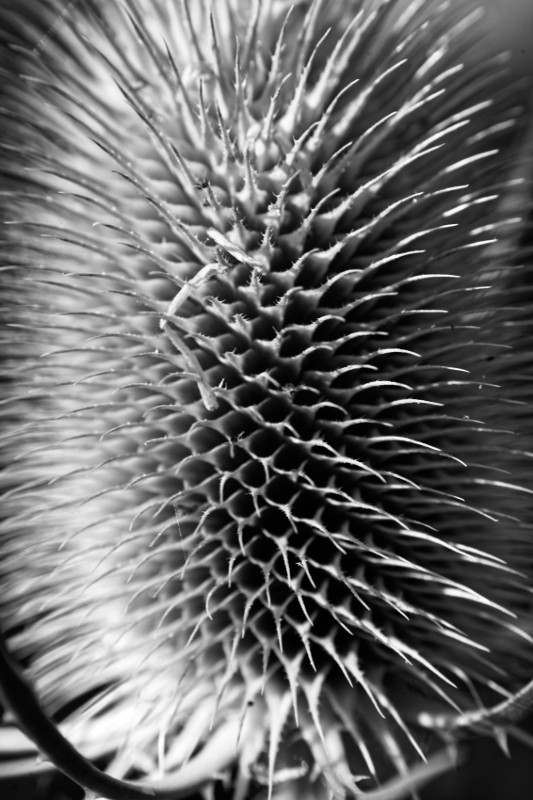 Teasels - Dipsacus sativus (chardon à bonnetier). Reverse 50mm handheld, natural light.