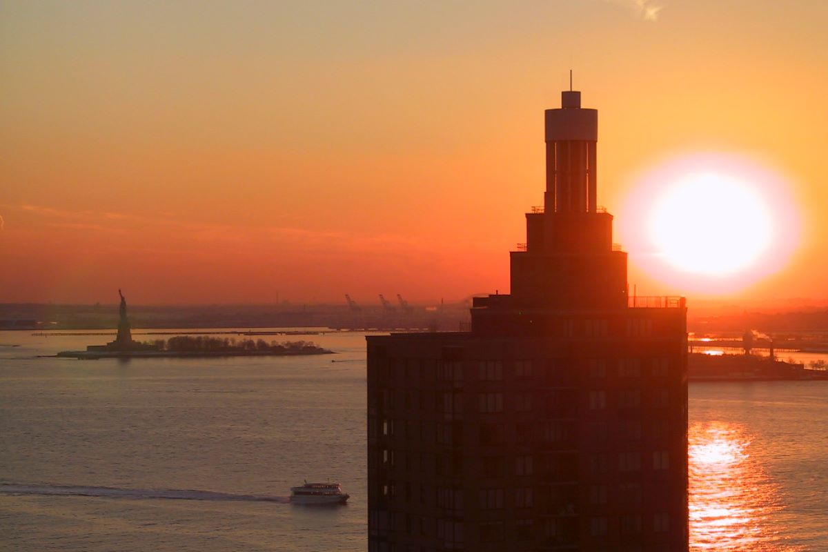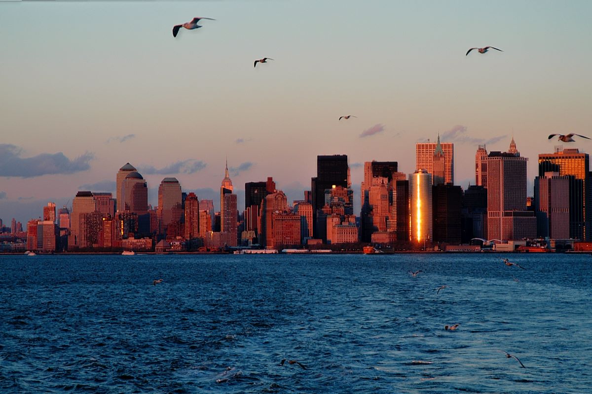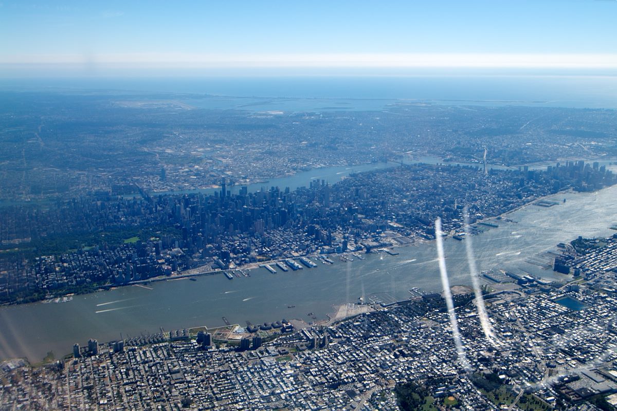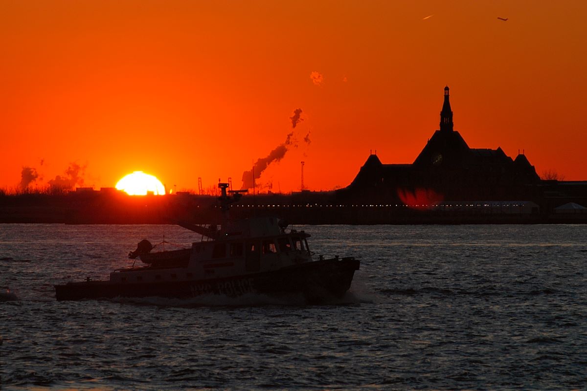 A boat fom New York, a plane from Newark and the railway station in New Jersey. Taken from the jetty at the World Financial Center.