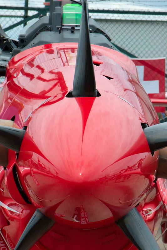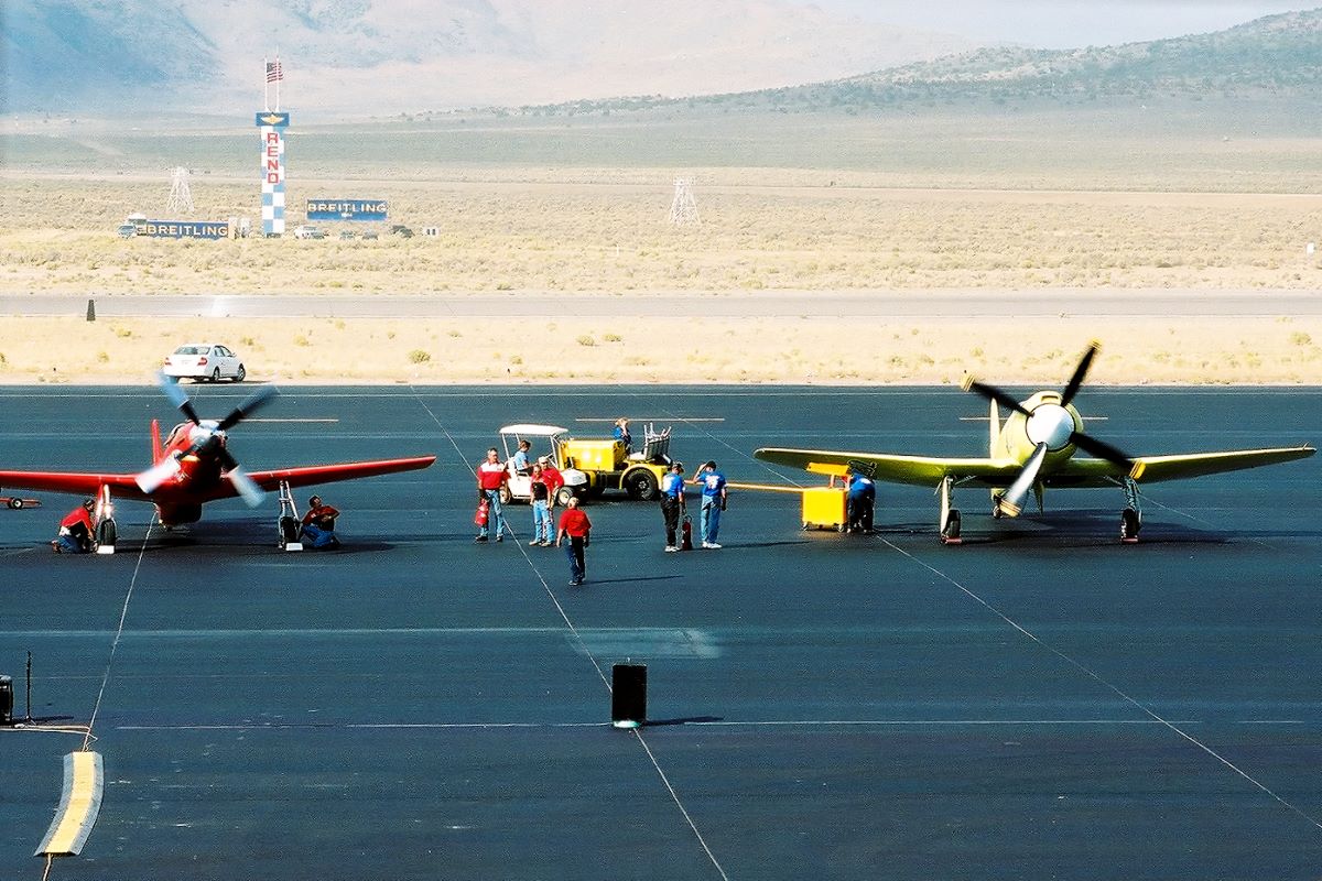 Modified warbirds 'Dago Red' (P51D - winner) and 'September Fury' (Hawker Sea Fury - 2nd place) before the unlimited Gold final at the 2002 Reno air races - Nevada. Nikon FA and 80-200. Film scanned by the lab.