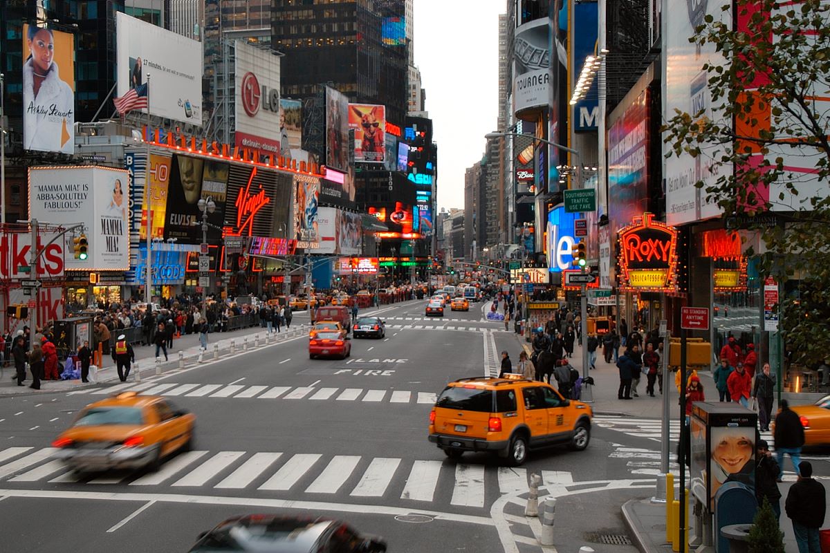 Time Square from the upper open deck of the 'tourist' bus, fighting the cold.