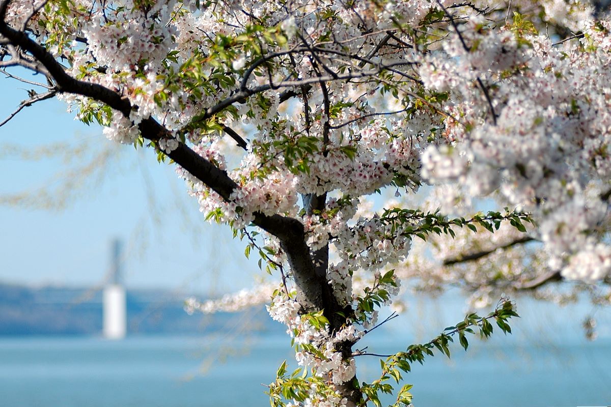 Blossoming tree in Riverside Park. New York - Upper west side. GWB bridge in the background.